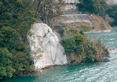 高所での作業や法面下道路の幅員も狭い現場では、クレーン・仮設足場による施工が困難です。しかし、SD工法であれば仮設足場が不用なのでダムなどの現場でも環境に配慮した施工が可能です。