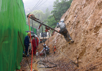 狭い場所でも作業が可能であるSD工法であれば国道や交通量の多い幹線道路沿いの法面での作業も最小限の交通規制で施工が可能です。