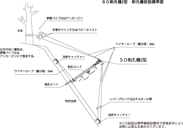 樹木が多く茂っている法面でも、仮設足場が不用で機材や装備がコンパクトなSD工法であれば、ほとんど伐採せずに施工することができます。