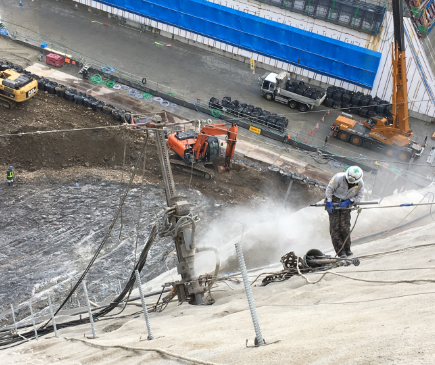 民家裏等の法面の間が最も狭いところでも施工が可能です。また、粉塵対策装置を使用して粉塵の飛散を抑制や騒音対策装置で騒音を低減し近隣住民への配慮も万全です。